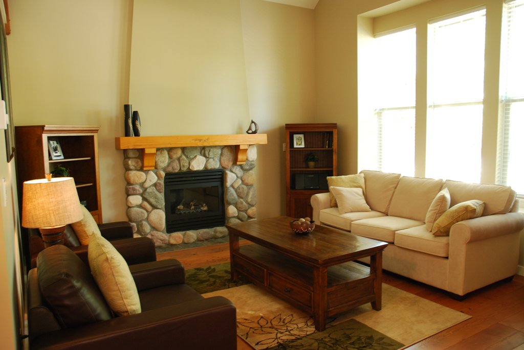 The main floor consists of a spacious living area finished with reclaimed wood flooring and river rock fireplace complete with