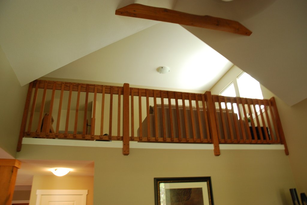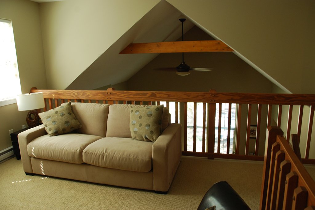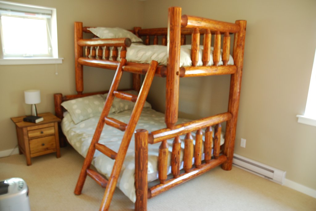 Upstairs has a second bedroom with a Custom Built Log Bed – Twin over Double. In addition the Loft area has a Double Sofa-Bed and a second 4 piece bathroom.
